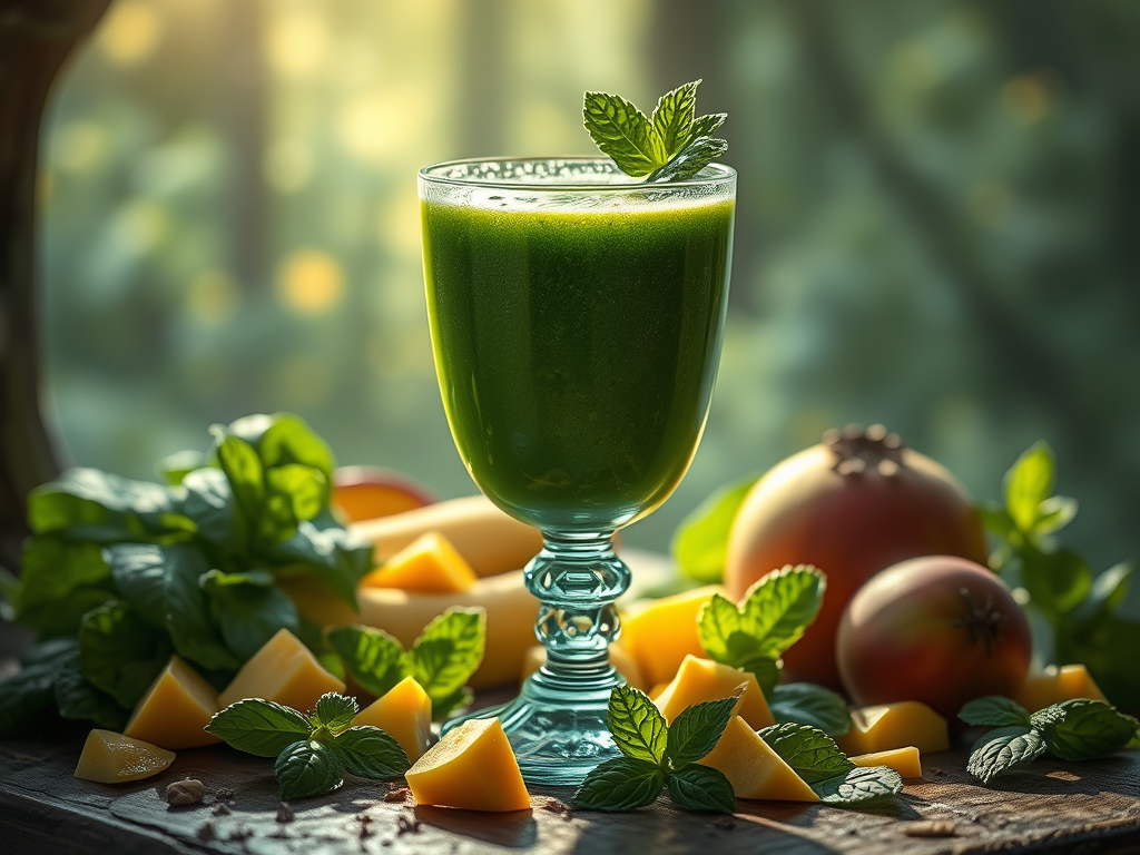 Layer the spinach, banana, coconut water or almond milk, mango chunks, chia seeds, and spirulina powder into your blender. If using honey or mint, add these last. Visualize the ingredients combining their magical properties to support your intention.